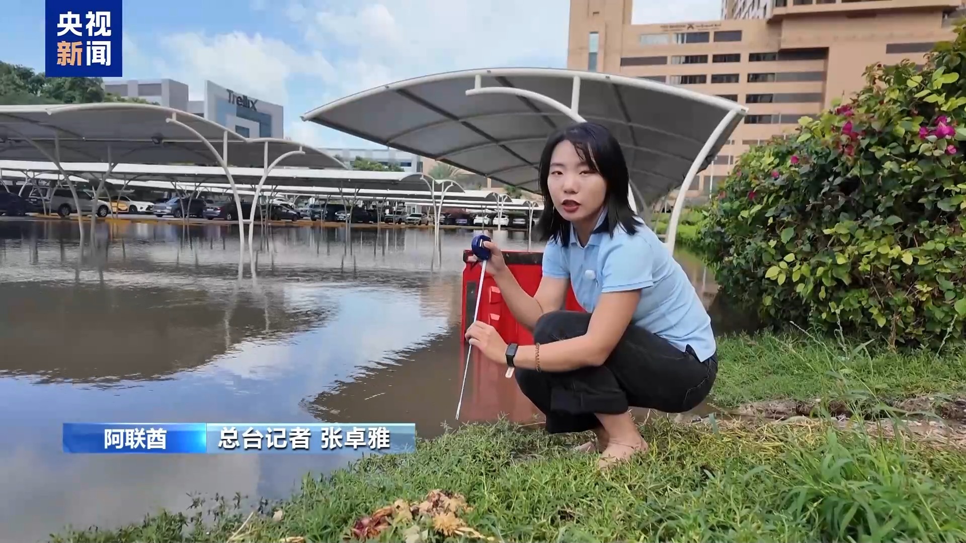总部记者 张卓亚:经过三个小时的抽水作业,我们看到这个停车场的水深仍然可以达到35厘米。