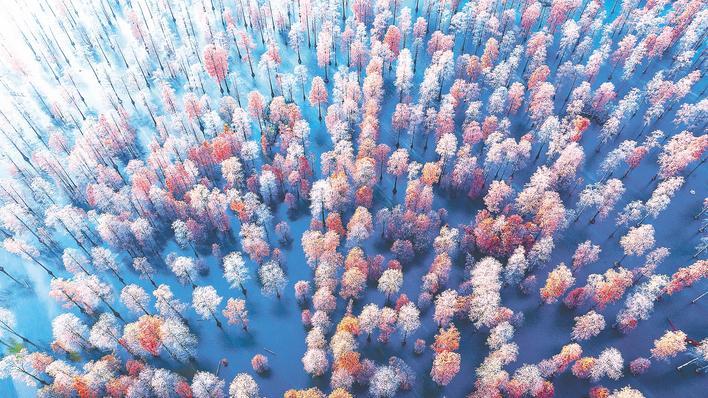 12月26日,在武汉市新洲区张都湖湿地水上森林公园,万余棵水中红叶的水杉树红如火,让人心旷神怡,宛如童话仙境。 水涨为浅滩,水落为湖。这是一个上升的湖渡口。 12月的深秋初冬,是观赏樟都湖水上森林的最佳时节。阳光、红杉和候鸟营造出特殊的冬季氛围。 (湖北日报全媒体记者 朱西勇 摄)